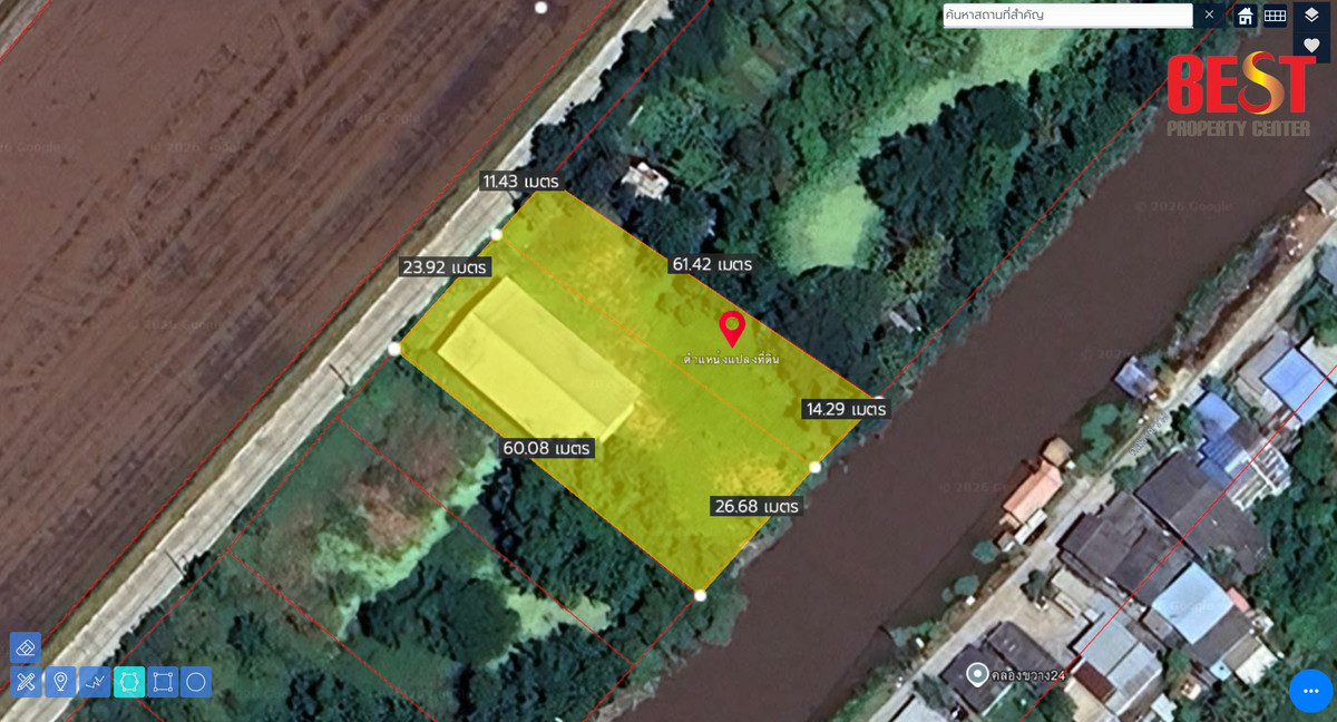 * หน้ากว้างติดถนนคอนกรีตประมาณ 35 เมตร